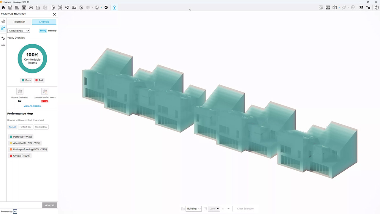 Hoe comfortabel voelt een ruimte aan voor gebruikers of bewoners? Vanaf nu zie je dat rechtstreeks in je model, al van bij de conceptfase. Enscape Impact maakt dat thermisch comfort visueel. Die informatie maakt het gemakkelijker om betere beslissingen te nemen, duurzame ruimtes te creëren en dure ontwerpwijzigingen te vermijden. En dat allemaal zonder complexe analyses.